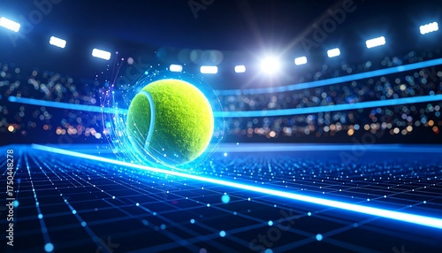 Futuristic Tennis Ball Dynamic Glow on Court with Blurred Stadium and Lights.