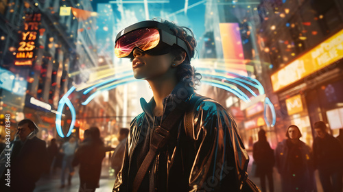 Futuristic Urban Scene with Man Wearing VR Headset and Neon Lights