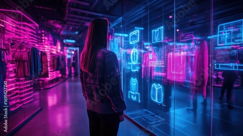 virtual, reality, shopping, retail, technology, future, fashion, neon, woman, digital, store, life events, interface, display, clothing, hologram, client, innovation, commerce, online, style, modern, futuristic, trend, graphic, glowing, interactive, visual, aesthetic, colourful, vibrant, light, design, window, girl