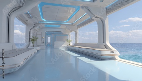 futuristic, corridor, white, ocean, view, roomy, modern, interior, design, window, blue, light, panel, seating, bench, plant, smooth, clean, bright, glasses, contemporary, architecture, spaceship, yacht, hallway, calm, water, sky, cloud, illuminated, polished, sleek, tech, advanced, cleanliness, calmness, wide, long, horizontal, perspective, exterior, seamless, smoothness, reflective, future, travel, transport, empty, minimalist