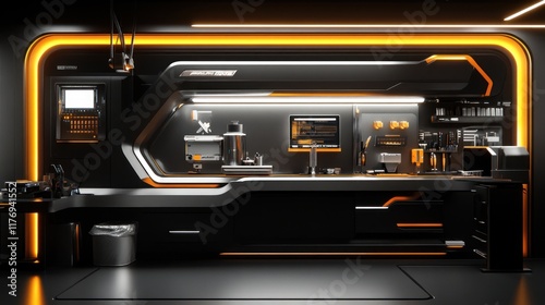 futuristic, workspace, office, technology, modern, design, interior, science fiction, dark, grey, metallic, neon, orange, lighting, wall, counter, equipment, screen, computer, desk, tool, panel, machine, laboratory, room, space, sleek, stylish, innovative, clean, sterile, industrial, advanced, digital, electronic, sophisticated, contemporary, abstract, background, setting, environment, scene, future