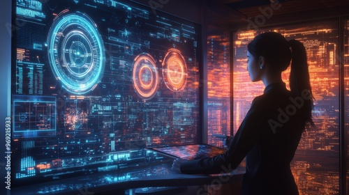 Futuristic workspace with holographic screens, virtual assistants, and AI-driven collaboration tools