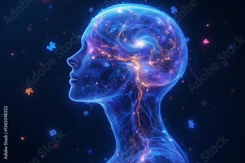 autism, spectrum, awareness, mind, concept, neurology, puzzle, connection, brain, galaxy, nebula, universe, star, stardust, cosmic, energy, complexity, individuality, diversity, difference, potential, thought, processing, aethereal, intelligence, innovation, scientific, exploration, futuristic, glowing, illuminated, vibrant, artistic, creative, imagination, technology, network, system