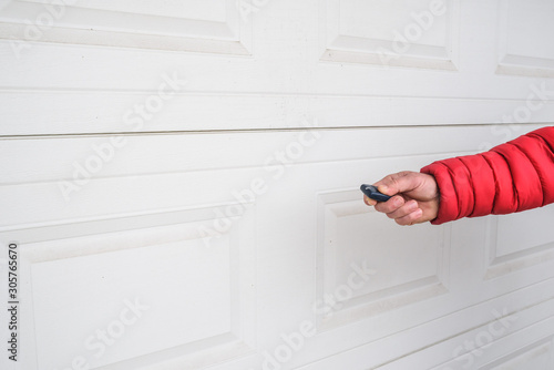 Garage door PVC. Hand use remote controller for closing and opening garage door