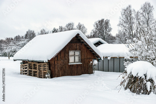 garden in winter, covered with snow, fruit trees, garden house and garden accessories
