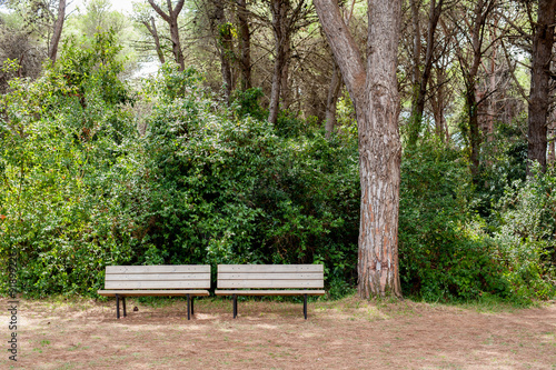 Garden with empty wooden bench and tree