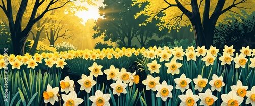 Garden with yellow daffodils and glowing sunlight illustration background design