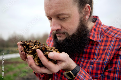 gardener, working, holding, smelling, gardening, production, growth, outdoors, day, organic, checked, cultivation, sustainability, organic food, mulch, one person, caucasian, dark hair, full beard, hand, german, product, pattern, agriculture, people, adult, man, beard, photo, color image