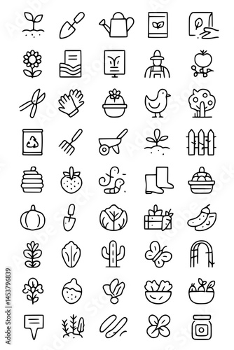 Gardening and Harvest Icons.gardening, harvest, seedling, shovel, watering can, seeds, book, flower, shears, gloves, pot, bird, tree, compost, rake, wheelbarrow, sprout, fence, beehive, strawberry,