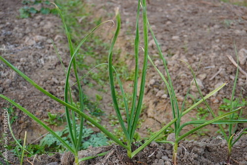 Garlic plants are growing on the ground