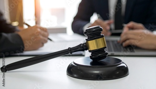 Gavel on desk with business people working.
