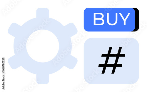 Gear, blue BUY button, and metadata tag symbol. Ideal for digital marketing, online shopping, website interface, social media, SEO, tech development, user interaction. Line metaphor