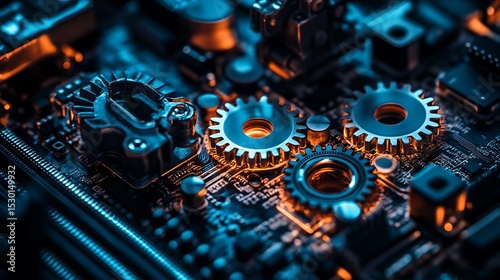 gear, sitting, circuit board, electronic, device, technology, machine, engineering, mechanical, metal, connection, component, mechanism, design, computer, equipment, part, macro, detail, closeup, lighting, blue, orange, dark, illuminated, glow, complex, system, background, abstract, structure, innovation, modern, future, network, digital, artificial intelligence, ai, robotic, datum, science, automation, development, manufacturing, industry, progress, technical, precision, concept
