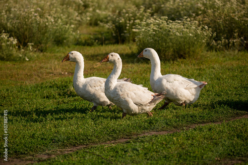 Geese and ducks walk on the grass in a green meadow in the pasture. Livestock raising and farming in the village.