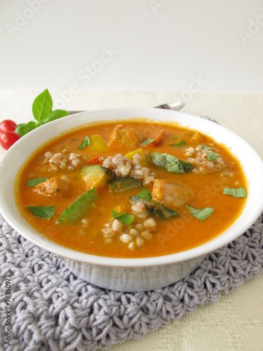 soup, vegetable, fish, buckwheat, paprika, courgette, tomatoes, basil, dinner, meal, food