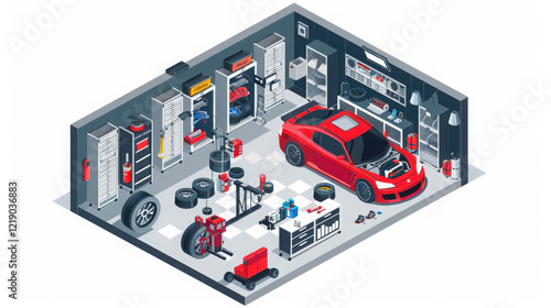 Generate an illustration of a isometric racing hangar in a flat, raw, caricature, cartoon style. Visualize the Garage in a style [JDM, Drifting, japan tuning,] that aligns with the car tuning theme.