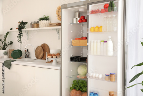 appliance, background, bottle, cold, contemporary, cool, decor, design, different, domestic, door, drink, electric, equipment, food, freeze, fresh, refrigerator, frost, fruit, full, furniture, grocery, healthy, home, house, household, indoor, interior, keep, keeping, kitchen, light, meat, modern, nobody, nourishment, object, open, preserve, product, refrigeration, refrigerator, shelf, storage, style, stylish, temperature, variety