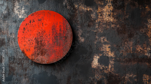 複雑な錆びの模様と赤い円盤が際立つ産業的デザイン、generative ai。