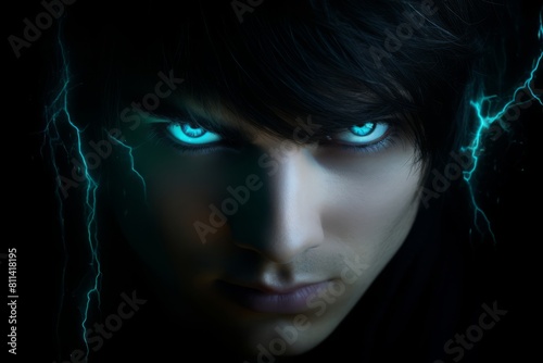 people, face, man, black hair, closeup, portrait, alien, westerner, lifestyle, solemn, good-looking, lightning, electricity, energy, power, feeling, expression, eye, light, blue, look, dark, black, model