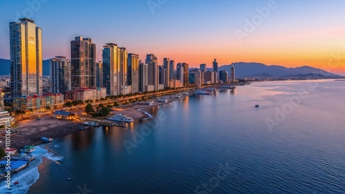 coastline, skyline, skyscraper, sunset, dusk, urban, architecture, reflections, beach, ocean, horizon, gold, vibrant, modern, glasses, lighting, evening, boat, water, wave, gradient, perspective, facades, calmness, indigo, modern architecture, golden hour