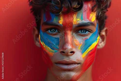 Generative AI illustration portrait of handsome young gay men with face painted by bright LGBT rainbow colors isolated on red background looking at camera