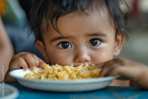 baby, children, small, eating, food, toddler, messy, cute, funny, children, mealtime, dinner, breakfast, snack, infant, meal, chair, spoon, crumb, dining, playful, face, laugh, smile, happy, young, feeding, joyful, little, innocent, home, kitchen, family, parenting, sweet, childhood, generative, ai, 116