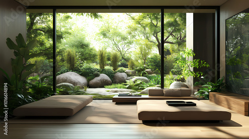 Generative AI, Peaceful Living Room with Neutral Tones and Large Windows to Nature