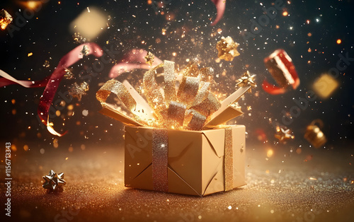 Generative-AI, Boxing Day Gift Box Explosion with Festive Sparkles and Ribbons