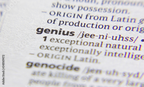 genius, definition, meaning, dictionary, cyclopaedia, word, highlighted, text, concept, conceptual, white, black, paper, page, magnifying, glasses