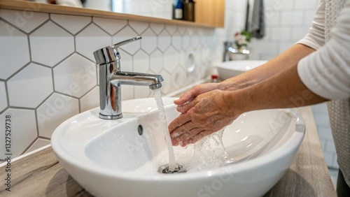Gentle Hands Cleansing Under A Stream Of Pure Water In A Modern, Bright Bathroom, Reflecting A Moment Of Daily Self-care With Hexagonal Tiles And Soft Light