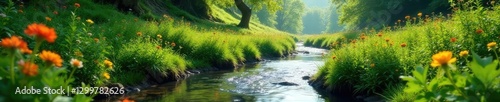 river, flower, landscape, scenery, sunshine, water, vale, stream, tree, plant