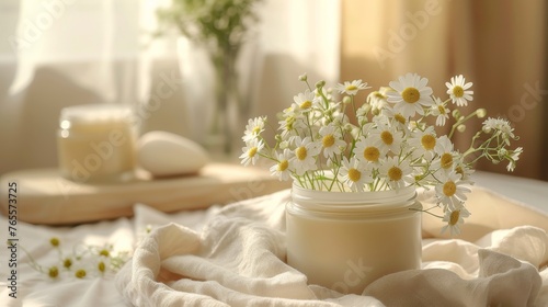 Gentle sunlight illuminates a jar of chamomile flowers on soft linen, evoking warmth and tranquility in a cozy setting