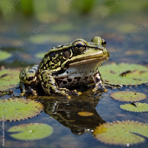 Gentle Watch: Marsh Frog Resting Beside Tadpoles in Tranquil Shallow Pool