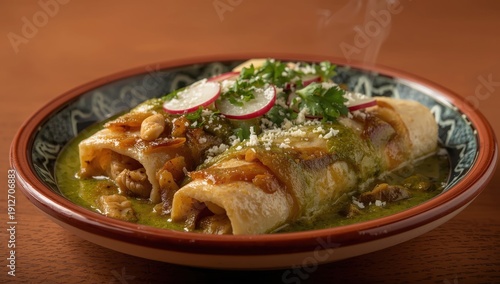 Genuine Mexican green chicken enchiladas with cheese, onion, and radish