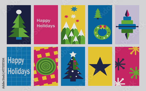 christmas, holiday, new year, happy, illustration, set, collection, bundle, banner, card, poster, template, vertical, geometric, abstract, modern, minimalist, pop art, flat, design, colourful, vibrant, bright, red, green, blue, yellow, pink, turquoise, tree, star, snowflake, chaplet, garland, mountain, landscape, winter, snow, pattern, shape, circle, square, spiral, element, decoration, greeting, party
