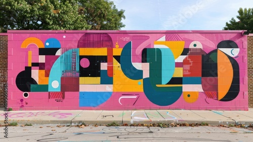 geometric colorful graffiti on brick wall. Abstract street art. memphis style.