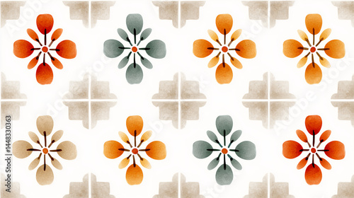 pattern, geometric, floral, design, motif, repeat, seamless, tile, texture, ornament, abstract, background, illustration, decorative, art, vintage, retro, surface, element, wallpaper, print, fabric, brown, orange, teal, white, warm, sand, tone, modern, graphic, style, creative, symmetry, shape, form, aesthetic, digital, artistic, isolated