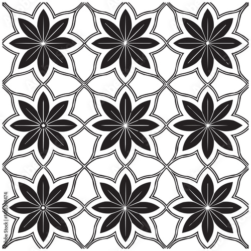 Geometric Floral Tile Pattern. Seamless Black and White Abstract Background, Vector geometric monochrome seamless pattern with curved shapes