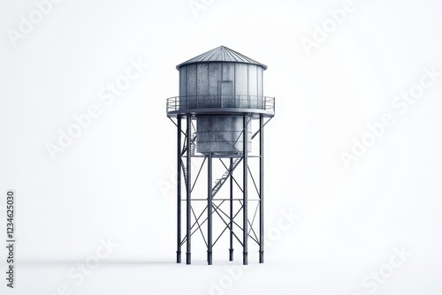 geometric metal water tower illustration with clean lines and minimalist design, floating against pure white space, technical schematic style