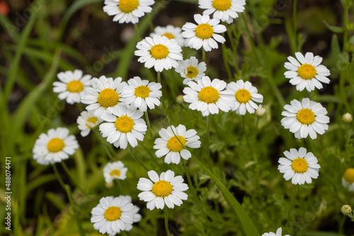 German tea chamomila (Chamomilla recutita) flowers on meadow