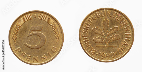 Germany - circa 1990: a 5 Pfennig coin of Germany showing a the number 5 with an ear of corn and a tree with foliage