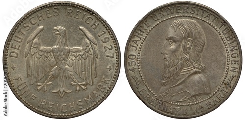 Germany German coin 5 five mark 1927, Weimar Republic, 450th anniversary of Tubingen University, eagle in center, denomination below, bust of person in medieval dress, silver,