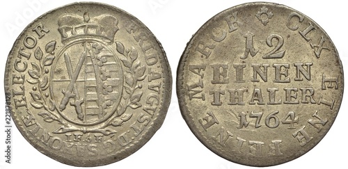 Germany German Saxony-Albertine silver coin 1/12 one twelfth of a thaler 1764, crowned shield with crossed swords and other designs flanked by branches, ruler Friedrich August, value and date,