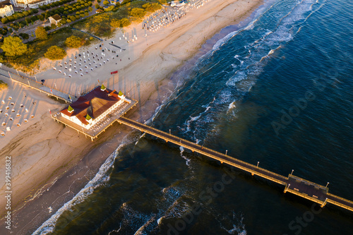 Germany, Mecklenburg-Western Pomerania, Heringsdorf, Aerial view of coastal pier at dawn