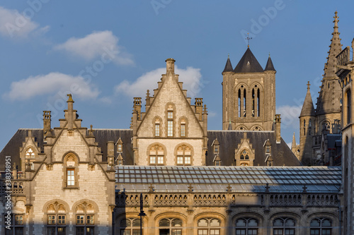 Ghent, Flemish Region / Belgium - april 24 2012 : the Façades of the Graslei, and the Gothic St Bavo's Cathedral in Ghent, Belgium
