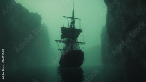 sailing, travel, exploration, ocean, eerie, ghostly, rendering, adventure, element, graphic, sea, silhouette, green, solitude, suspense, vessel, design, perspective, illustration, enigma, art, journey, nature, digital, cliff, landscape, ominous, thriller, dramatic, skittish, environment, nautical, mist, mystery, isolation, ship, ancient, rock, dark, water, shadow, fog, atmosphere