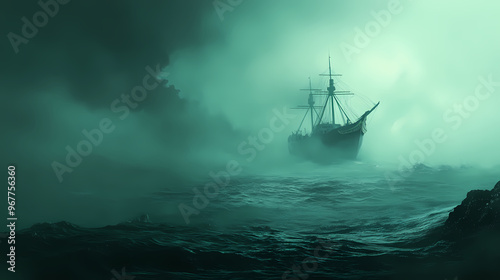 ghost, ship, ocean, large, boat, float, distance, floating, illustration