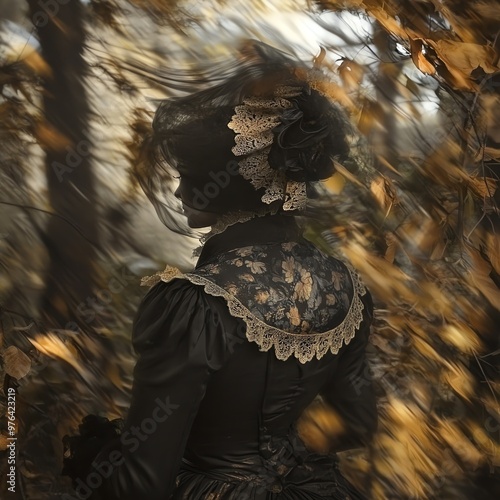 ghostly, figure, victorian, autumn, outfit, surround, swirl, leaves, dark, mysterious, ambience, foliage, whisper, spirit, detail, atmosphere, silence, portrait, enchant, surreal, costume, vision, essence, shadow, aethereal, nature, gothic, invoking, decay, nostalgia, allure, landscape, season, specter, drama, fantasy, whimsy, folklore, twilight, forest