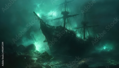 ship, ghost, wreck, ocean, sea, water, storm, wave, fog, mist, galleon, pirate, vessel, nautical, maritime, adventure, mystery, supernatural, aethereal, atmospheric, haunting, ominous, mysterious, eerie, skittish, fantasy, imagination, surreal, dreamlike, gothic, dark, moody, gloomy, spectral, apparition, paranormal, mythical, legend, folklore
