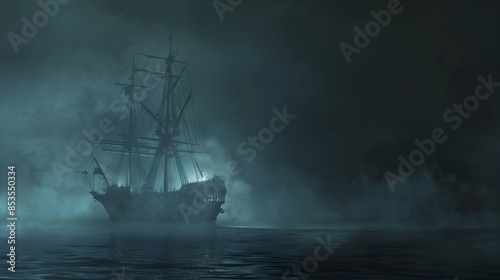 Ghostly Phantom Ship Sailing Through Misty Nighttime Sea